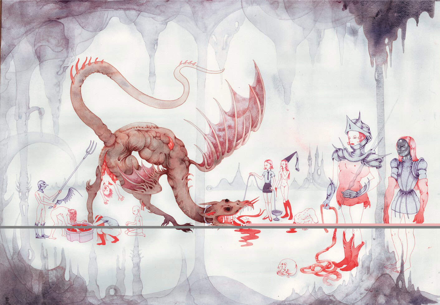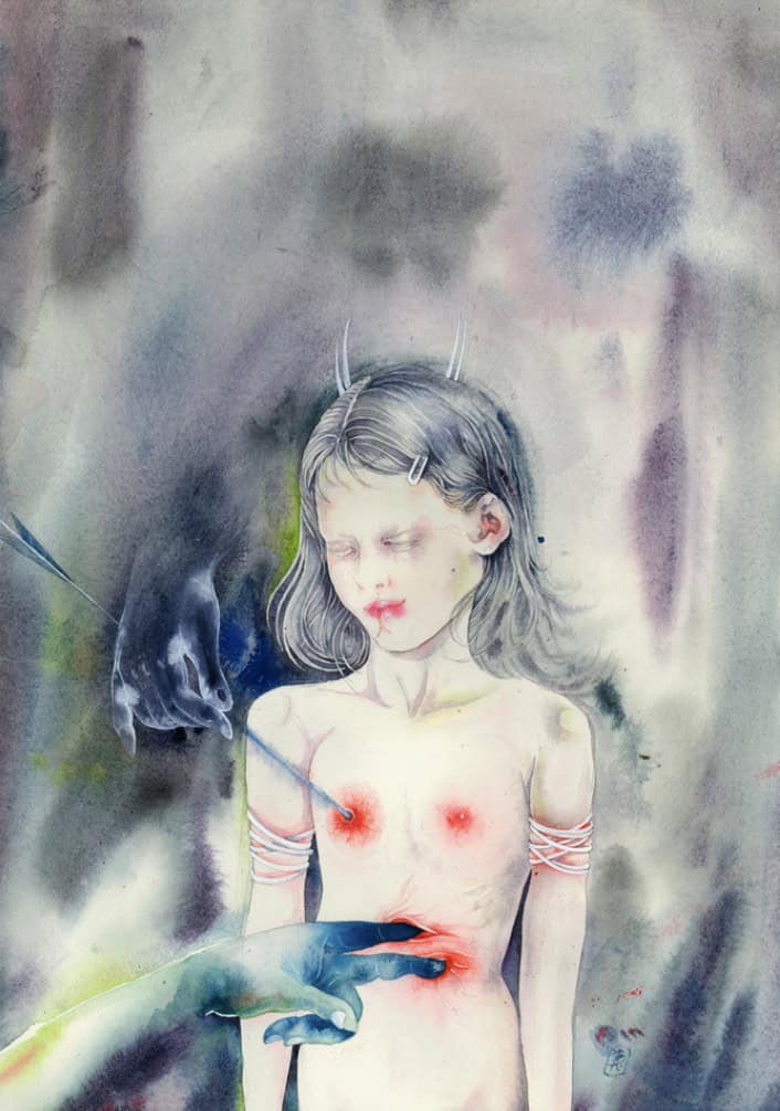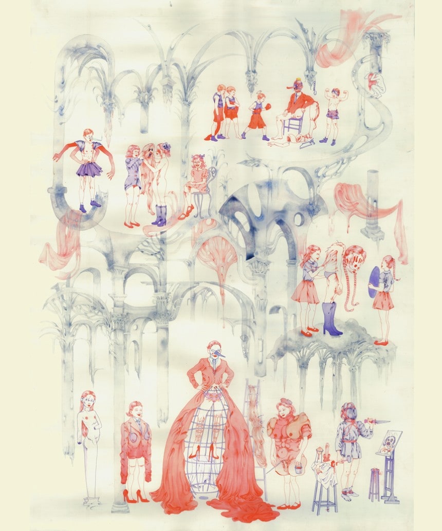 Amélie Barnathan est une artiste franco-italienne diplômée du Royal College of Arts de Londres en 2016. S’exprimant dans les domaines du dessin, de l’illustration et de la peinture. Son travail relève d’un rapport intime, profond, presque obsessionnel à son art. Le dessin possède selon elle une importance et un sens à réévaluer, et s’inscrit comme un révélateur d’inconscient face à l’immédiateté visuelle de notre ère numérique. Ses propositions sont expressives et souvent complexes : ses visuels possèdent une puissance narrative, nourrie de sources multiples, notamment des concepts du sublime et du grotesque. Ils convoquent l ’historique et le mythique, l’imagerie des rêves et des cauchemars. A travers ses dessins Amélie Barnathan ouvre de nouveaux univers, alternatifs, absurdes, nourris de références historiques et contemporaines aussi bien que de fantasmes et de désirs hautement personnels. Ses travaux récents explorent l’identité et la sexualité féminine, le psychisme à l’adolescence, les traumatismes et les représentations monstrueuses dans l’histoire de l’art.