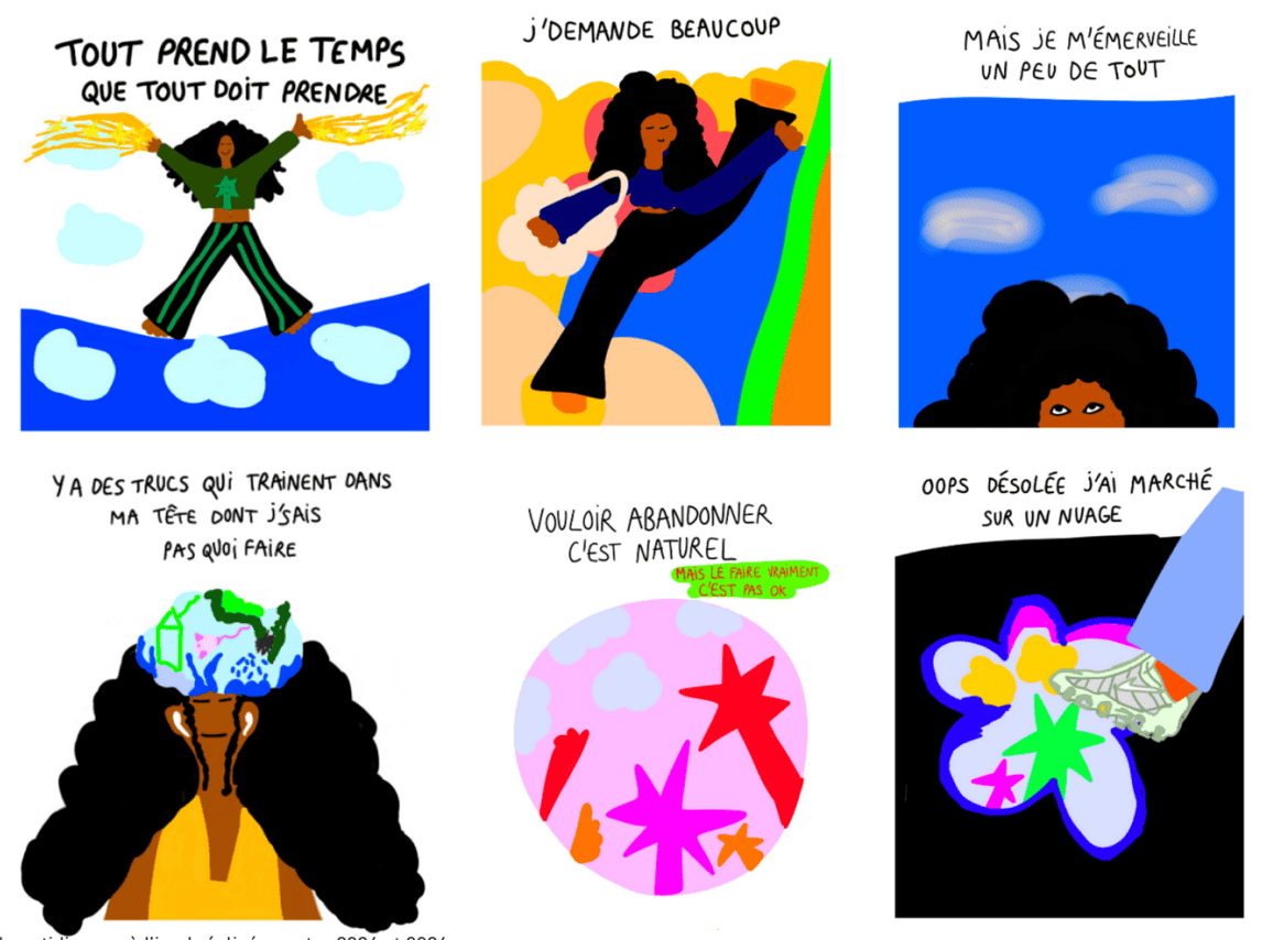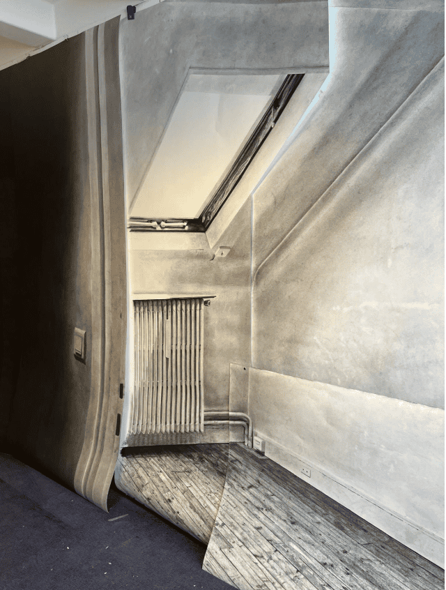 Ce déplacement fait écho au contexte même de la résidence. Pendant six mois, dans le cadre de leur résidence à la Drawing Factory, les artistes ont partagé un immeuble au 61 rue de Richelieu. Ils y ont travaillé, mais aussi cohabité, traversé des espaces communs, occupé des temporalités multiples. Résider ne désigne pas seulement une condition de production, mais une manière d’être là, ensemble. Les expériences ont été diverses — parfois solitaires, parfois poreuses — mais persistait la conscience de l’autre, de l’autre côté du mur.