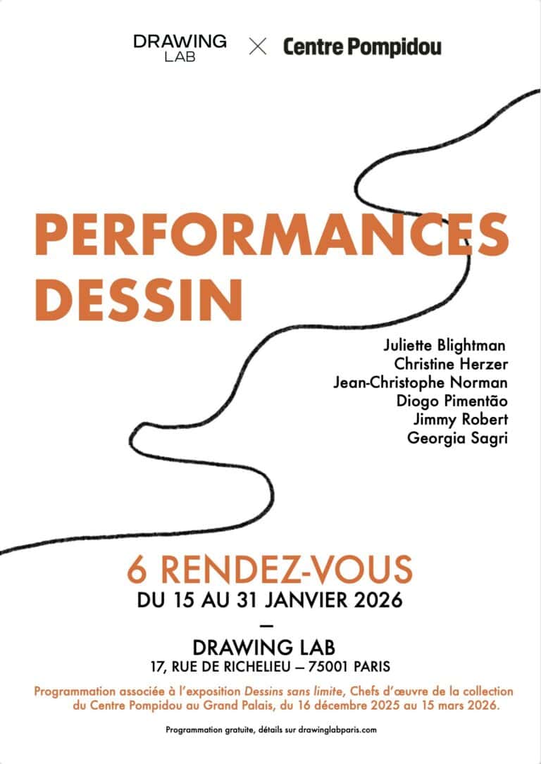 Six artistes ont été invités au Drawing Lab pour un cycle de performance dans le cadre de l’exposition « Dessins sans limite » au Grand Palais : Christine Herzer, Diogo Pimentão, Georgia Sagri, Jean-Christophe Norman, Jimmy Robert et Juliette Blightman.